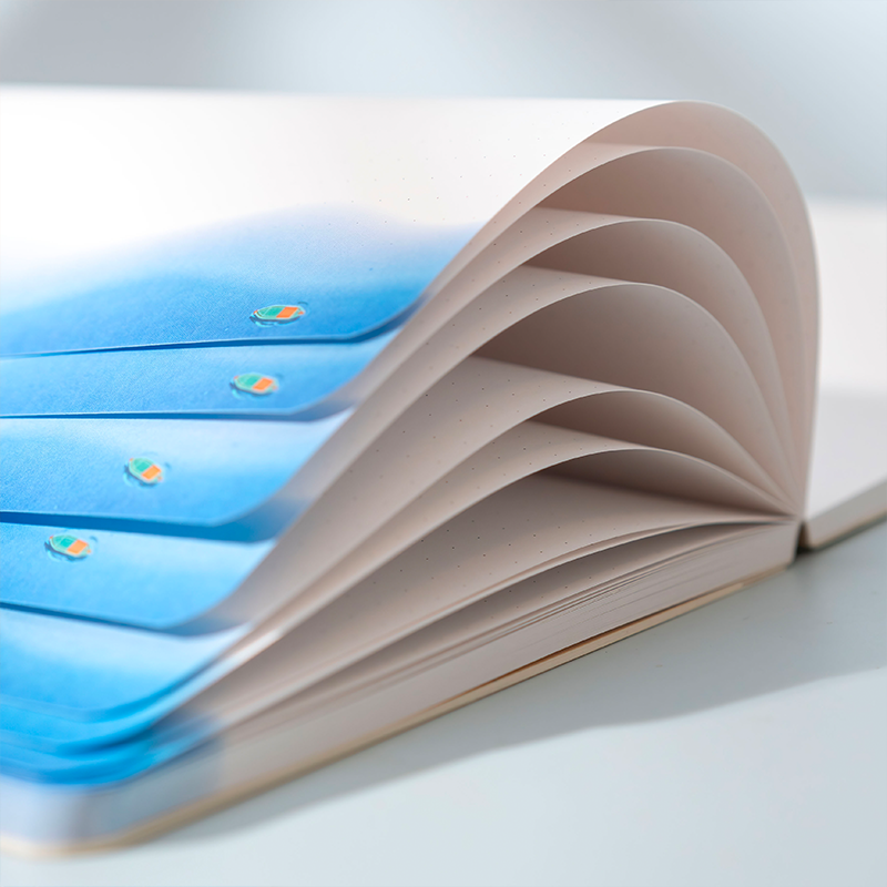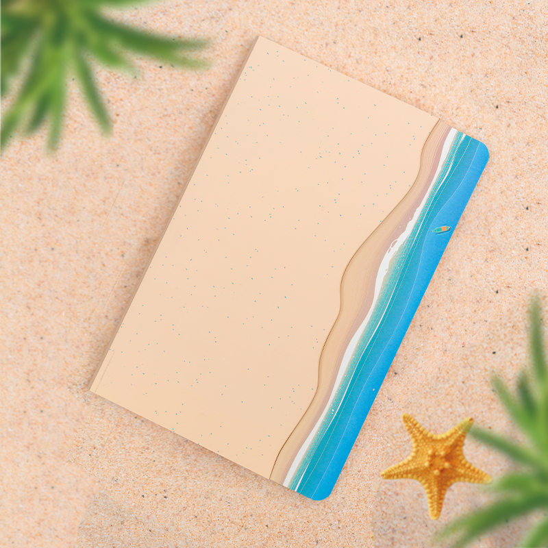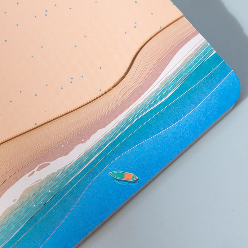 This notebook with the theme of a beach boat features a uniquely shaped cut cover design. It mimics the texture of the coastline, depicting the sea surging onto the beach with the ebb and flow of the tides layer by layer, perfectly recreating the carefree seaside scene in summer. Even the cover is designed to have the grainy feel of the beach.