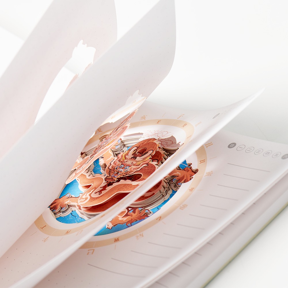 It is worth mentioning that the inner page design of this notebook includes fill-in dates, ruled lines and dot matrices. The edges of the hollow-out part are arranged according to the mysterious theory of the Heavenly Stems and Earthly Branches in Chinese culture. It is not only aesthetically pleasing as a decoration but also practical for writing. Whether it is given as a gift or used for oneself, it is a great choice.