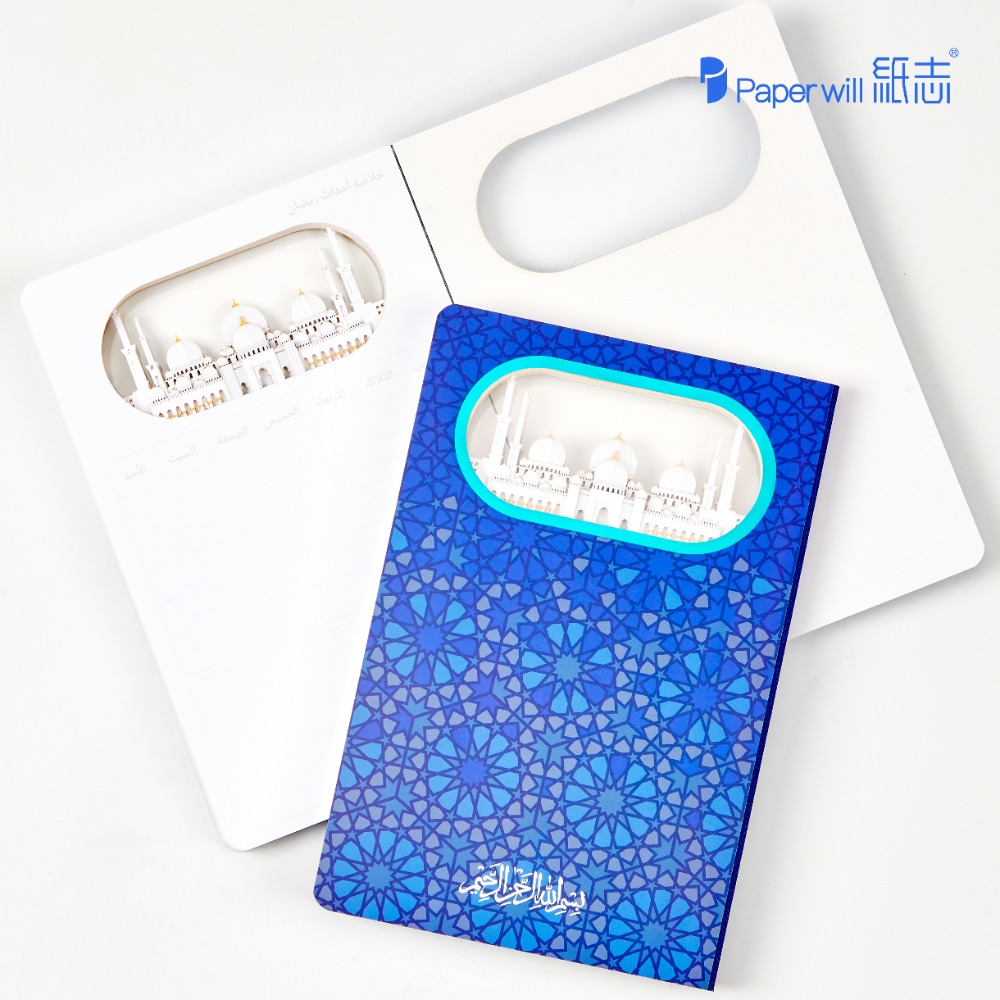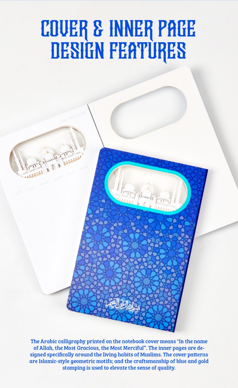 The Arabic calligraphy printed on the notebook cover means "In the name of Allah, the Most Gracious, the Most Merciful”. The inner pages are designed specifically around the living habits of Muslims. The cover patterns are Islamic-style geometric motifs; and the craftsmanship of blue and gold stamping is used to elevate the sense of quality.