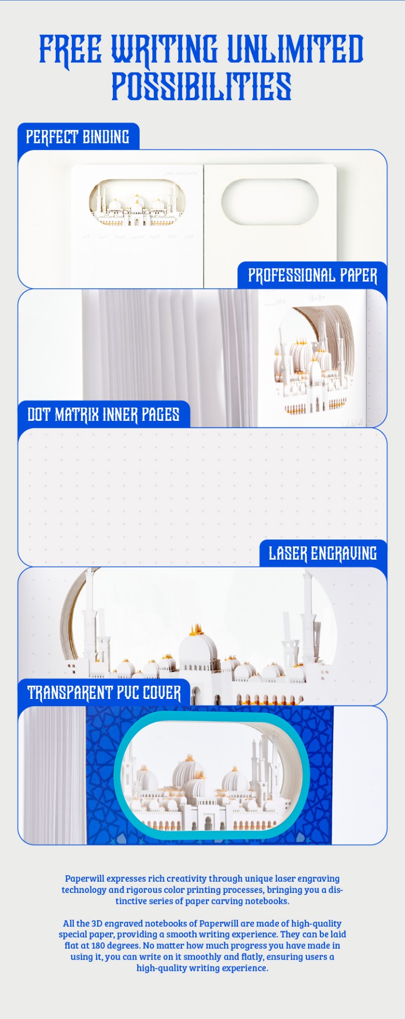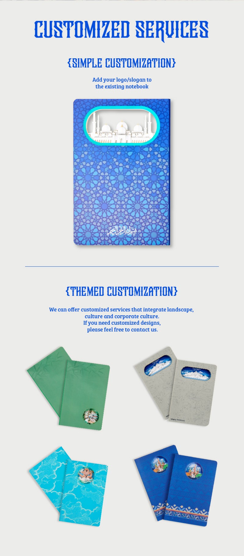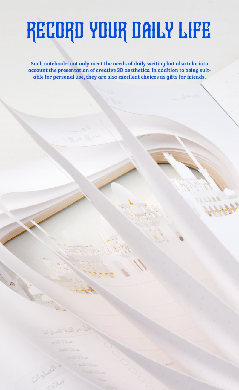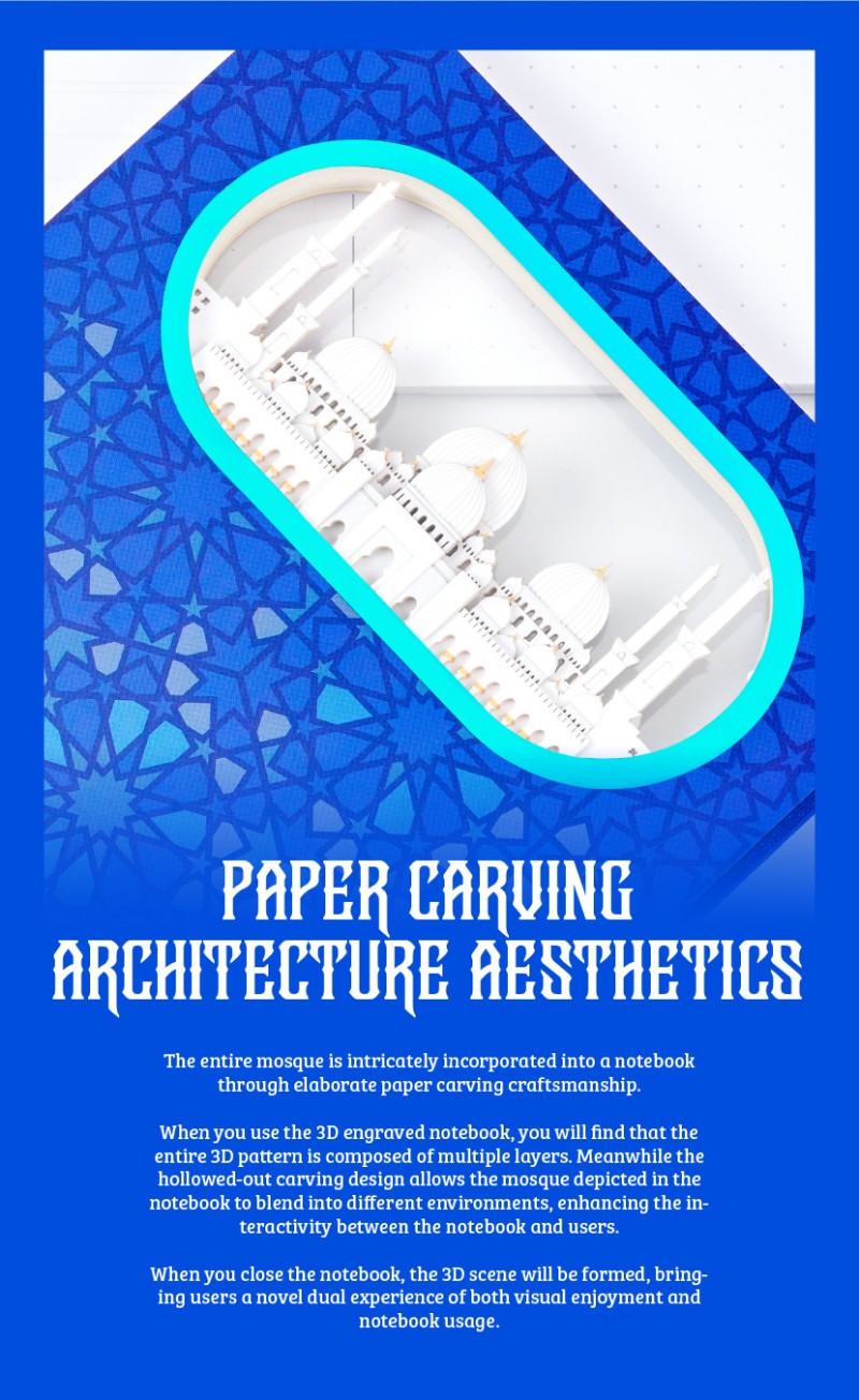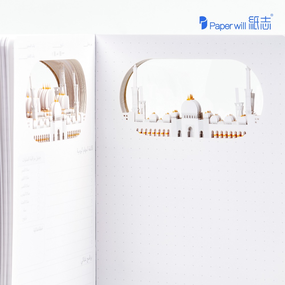When you use the 3D engraved notebook, you will find that the entire 3D pattern is composed of multiple layers. Meanwhile the hollowed-out carving design allows the mosque depicted in the notebook to blend into different environments, enhancing the interactivity between the notebook and users.