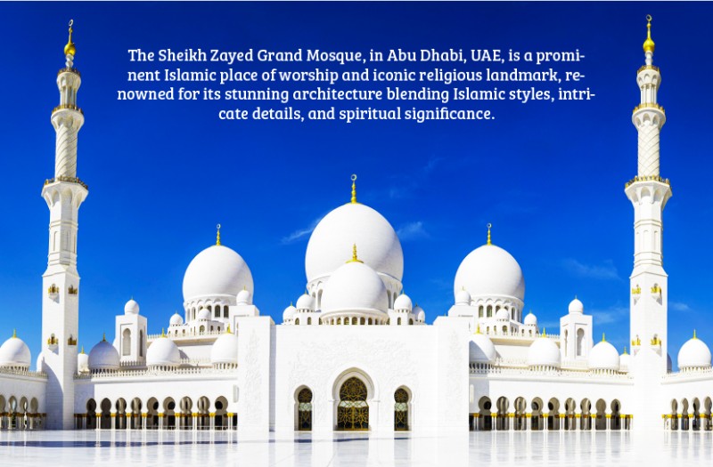 The Sheikh Zayed Grand Mosque, in Abu Dhabi, UAE, is a prominent Islamic place of worship and iconic religious landmark, renowned for its stunning architecture blending Islamic styles, intricate details, and spiritual significance.