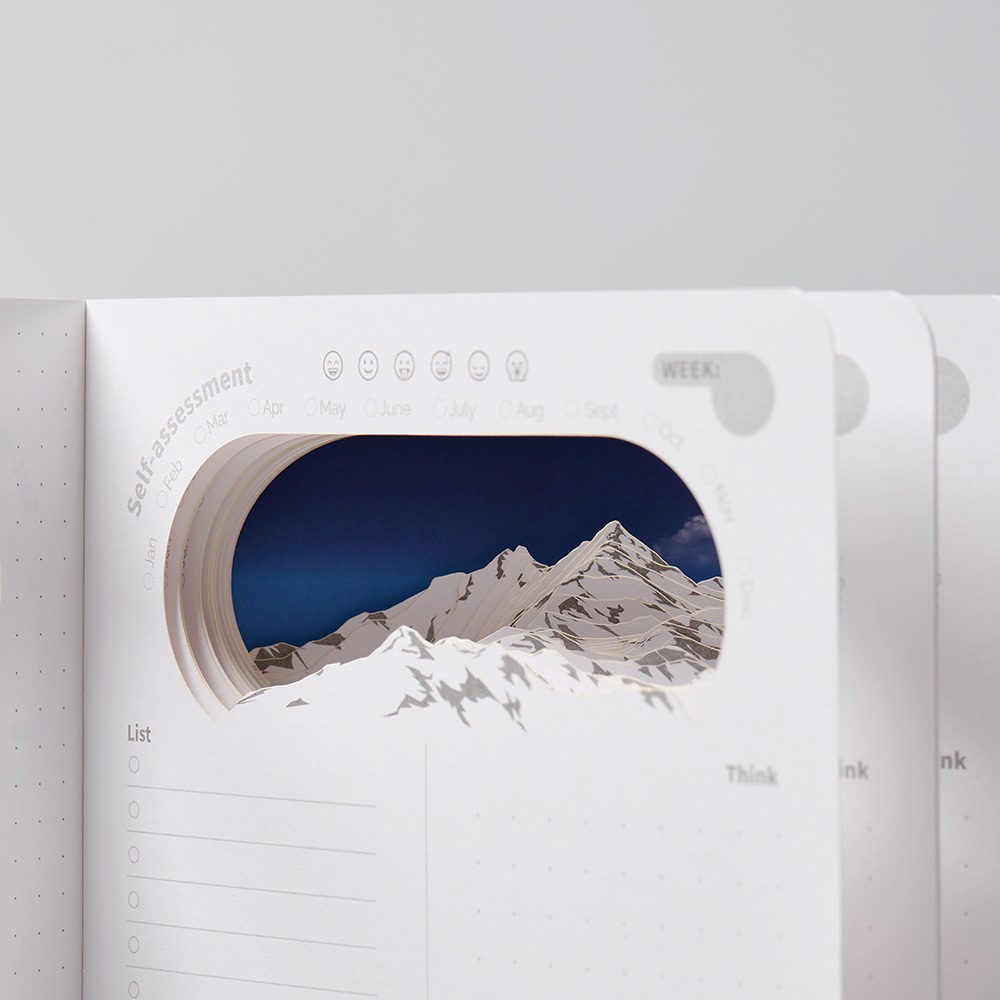 he mountains in the hollowed-out part are stacked layer upon layer, and the climbing routes are subtly hidden within. The inner pages are equipped with weekly and monthly plans. Through the division of different dimensions, it helps you better set goals, summarize and review, and become a better version of yourself.