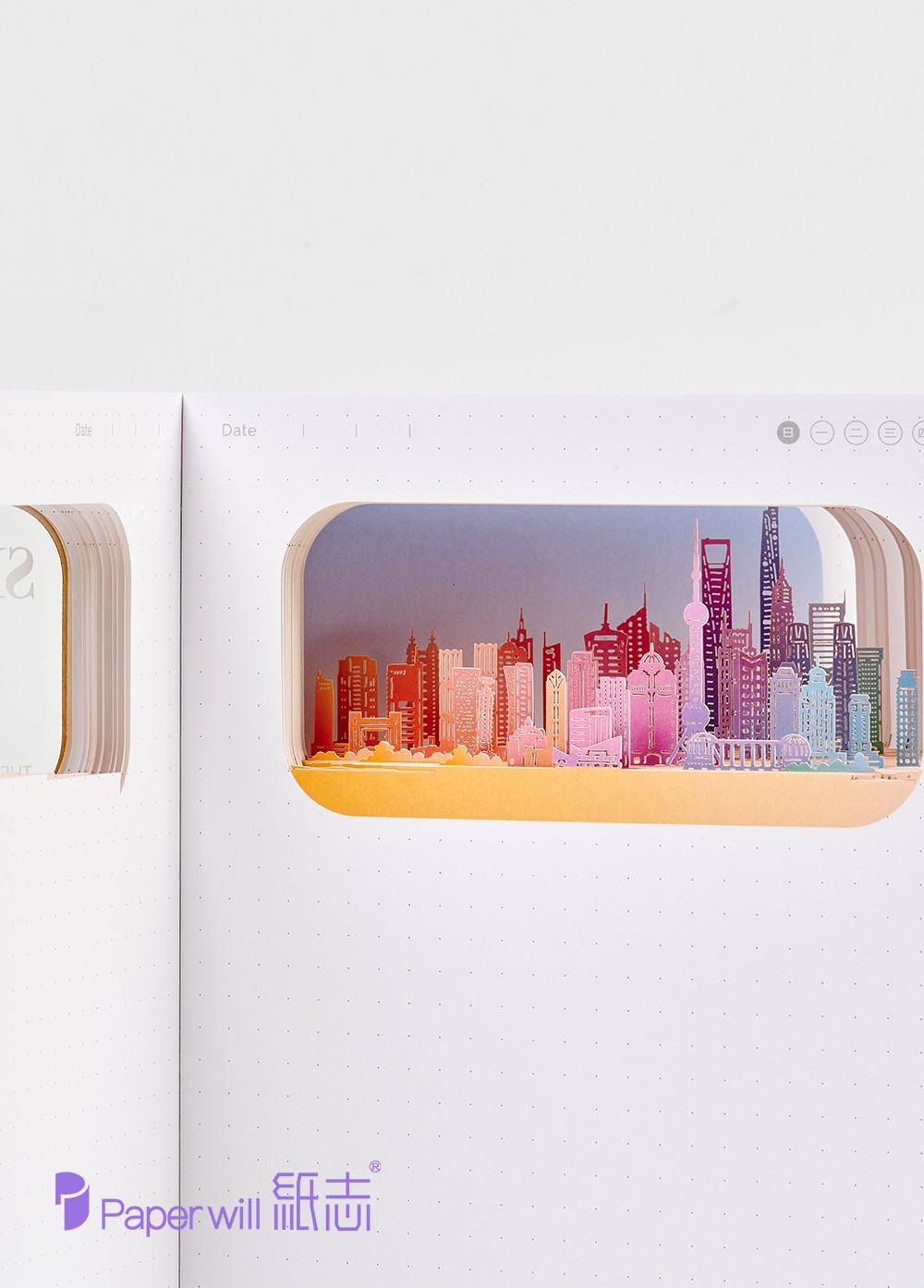 The 3D paper sculpture notebook is a uniquely creative and artistically captivating piece. It seamlessly blends laser engraving with precise printing to showcase unparalleled craftsmanship. Layer upon layer of paper intricately stacked creates a mesmerizing three-dimensional tableau, allowing viewers to appreciate the perfect fusion of art and technology.
